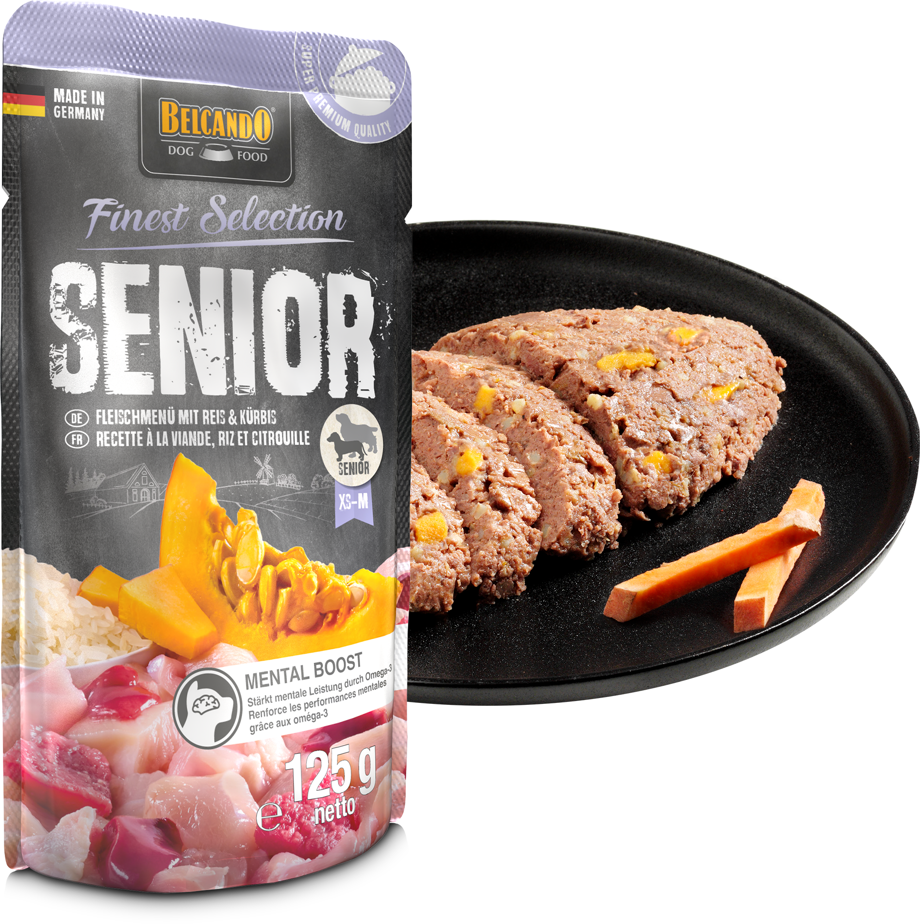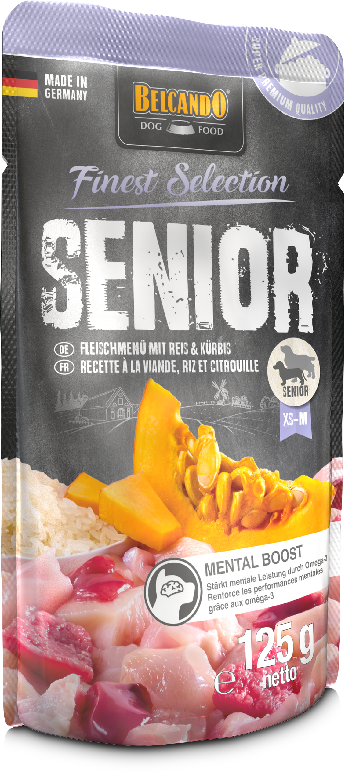 Mit dreifachem Wau-Faktor: Weil Fleisch auch im Alter für Hunde einfach der Hit ist, verwöhnen wir Deinen Senior direkt mit drei bekömmlichen Sorten in einer besonders saftigen Rezeptur. Mit seiner mild-nussigen Süße leistet Kürbis nicht nur einen geschmacklich interessanten, sondern auch gesunden Beitrag. Leicht verdaulicher Reis bietet Hunden mit verringertem Aktivitätsniveau die ideale Energiemenge, ohne dabei den Kalorienbedarf zu übersteigen. Das enthaltene Omega-3 stärkt zusätzlich die mentale Leistung Deines Seniors und trägt dazu bei, dass er auch im Alter seine geistige Fitness bewahrt. Ein weiteres Plus der BELCANDO Finest Selection: weiches und glänzendes Fell dank der Extraportion Distelöl.