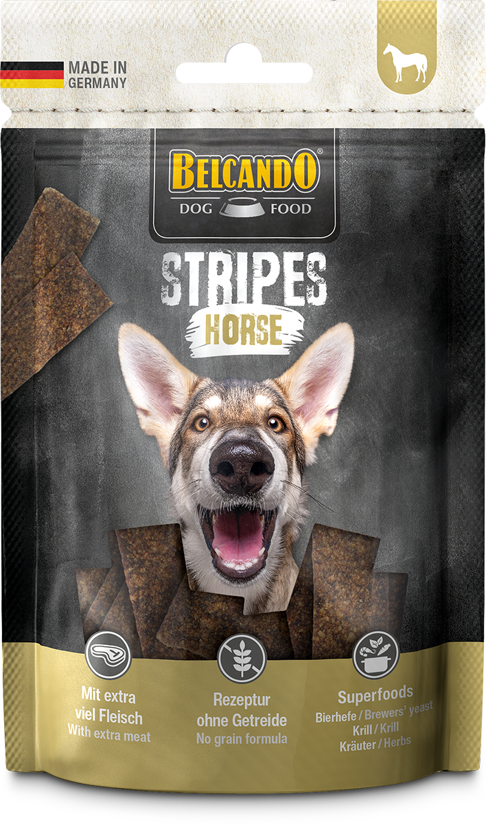 Für Kau-Boys und -girls! Hier kommen vierbeinige Pferdefleischliebhaber ganz auf ihre Kosten. Denn die Stripes Horse sind reich an Geschmack, leicht verdaulich – und noch leichter zu genießen! Abgerundet wird das Snack-Erlebnis mit den nähr- und vitalstoffreichen Superfoods Bierhefe und Krill sowie aromatischen Kräutern für noch mehr Geschmack. Die Stripes sind natürlich „Made in Germany“ mit extra viel Fleisch und werden schonend luftgetrocknet. Die Rezeptur verzichtet auf Getreide und als praktische Streifen lassen sich die Snacks ganz einfach individuell portionieren.