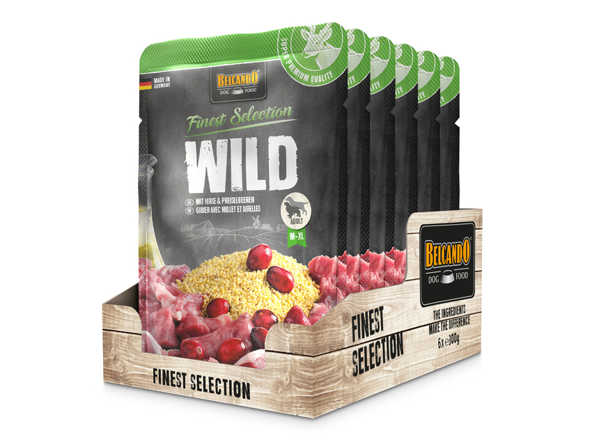 Exzellente Rezepturen in praktischen Einzelportionen. Saftiges Fleisch, mit raffinierten Zutaten verfeinert, wird schonend im Portionsbeutel gegart. Kalt gepresstes Distelöl liefert essentielle ungesättigte Fettsäuren. Außergewöhnlich schmackhaft und bekömmlich eignet sich BELCANDO® Finest Selection hervorragend für sensible oder wählerische Hunde.
