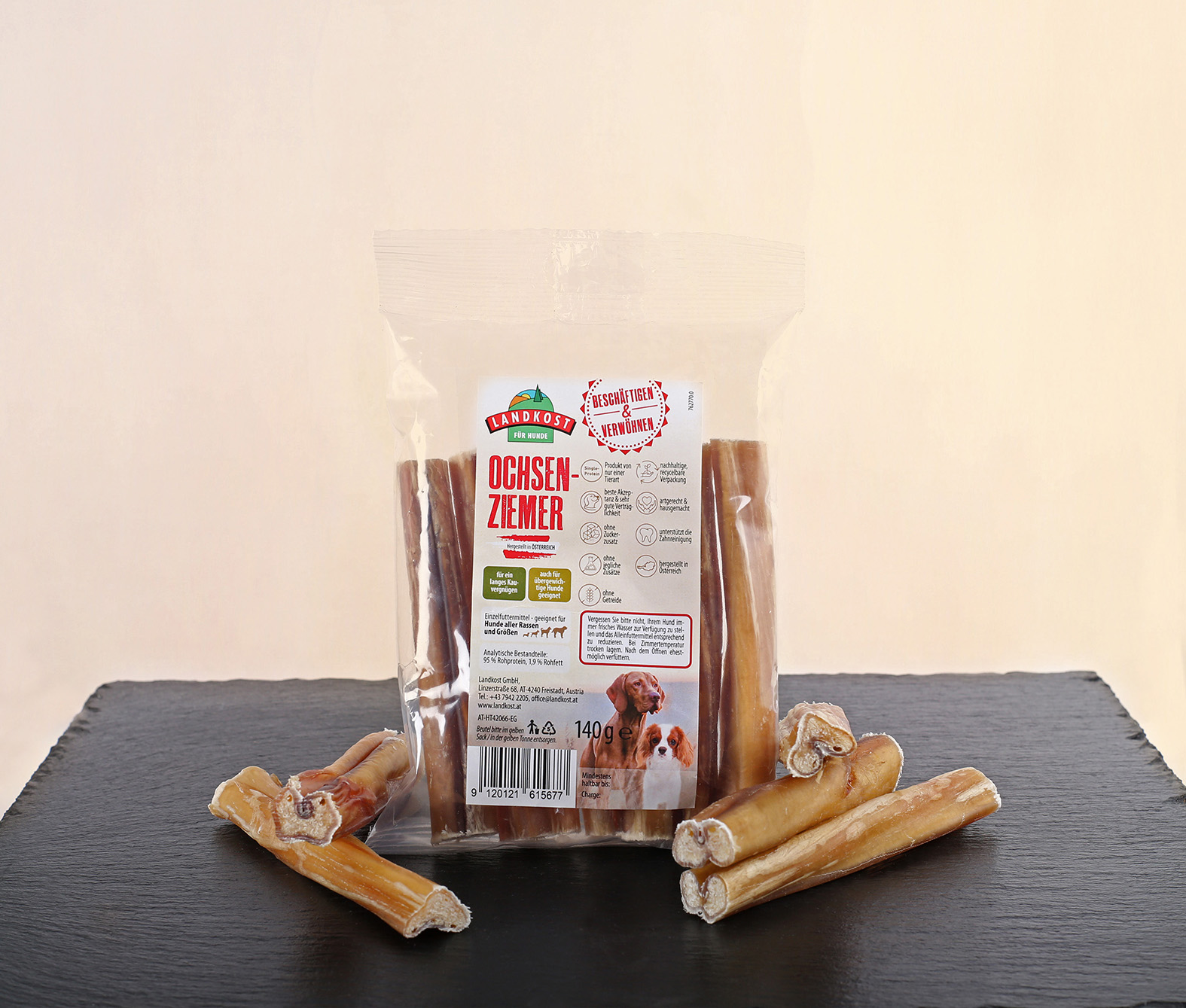 Unsere Landkost Ochsenziemer werden schonend luftgetrocknet und in 12cm Stücke geschnitten.