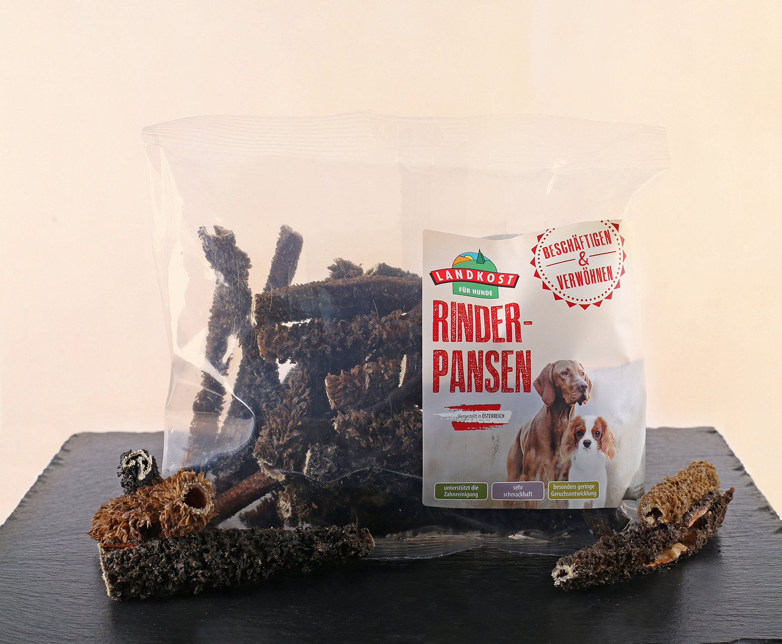 Unser grüner Landkost Pansen wird schonend getrocknet und frisch verarbeitet, dadurch