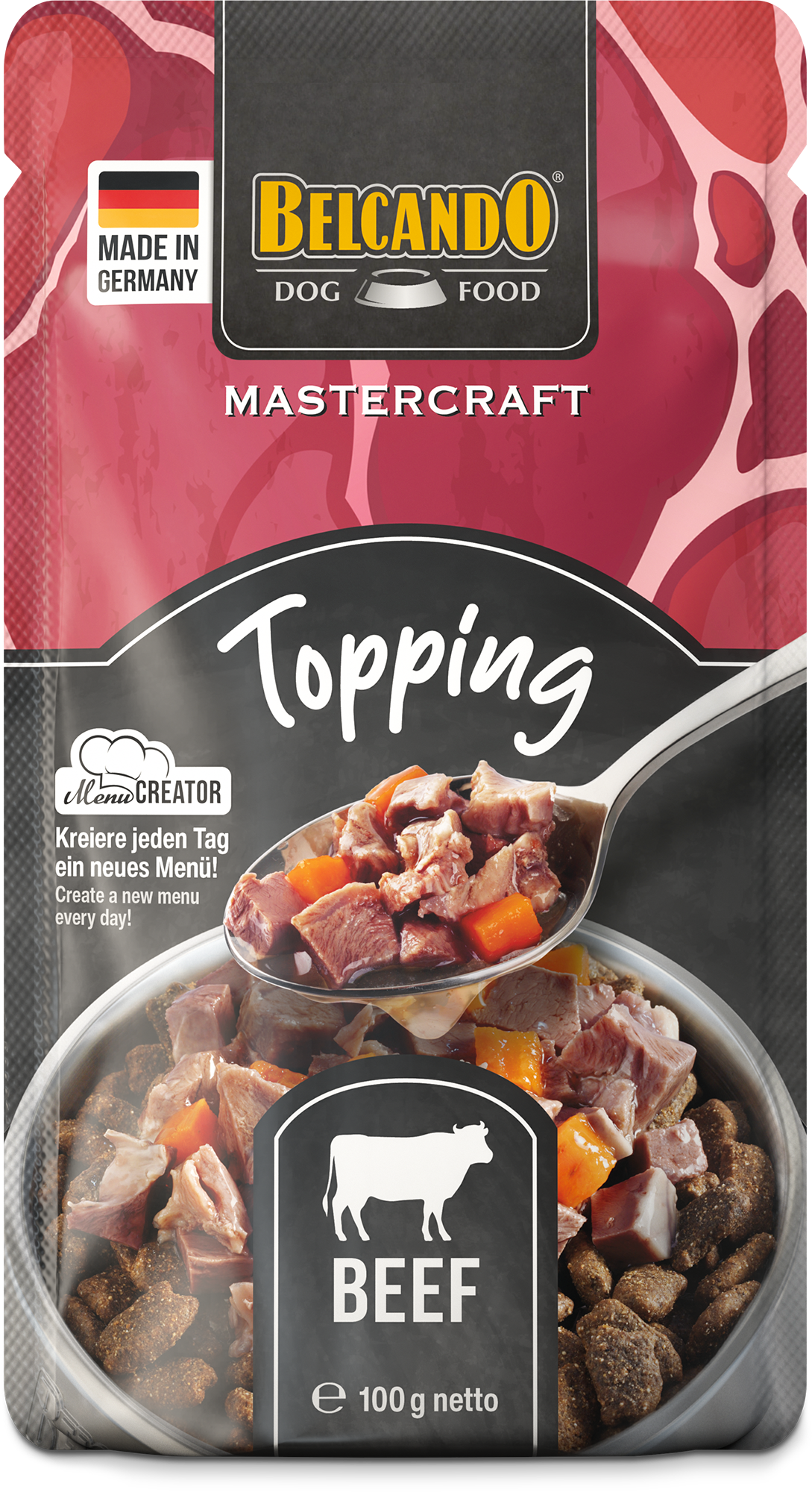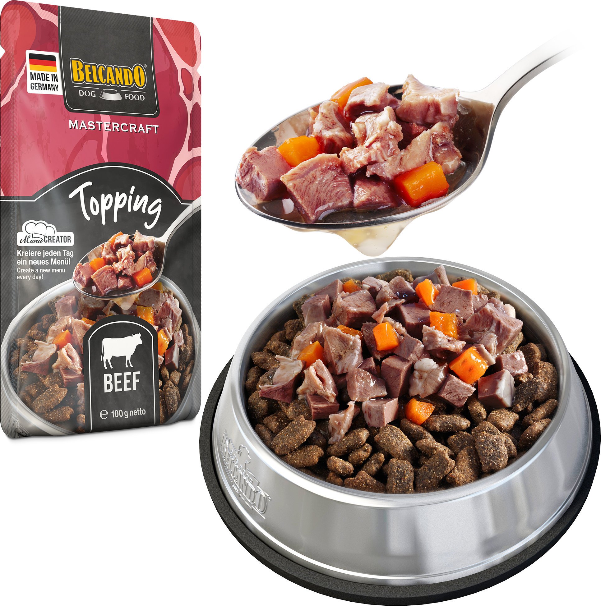 Ihr Hund ist ein echter Feinschmecker und liebt den Geschmack von knackigen Kroketten und schonend gegarten, saftigen Fleischwürfeln in leckerer Brühe? Dann sind unsere Toppings genau die richtige Lösung.