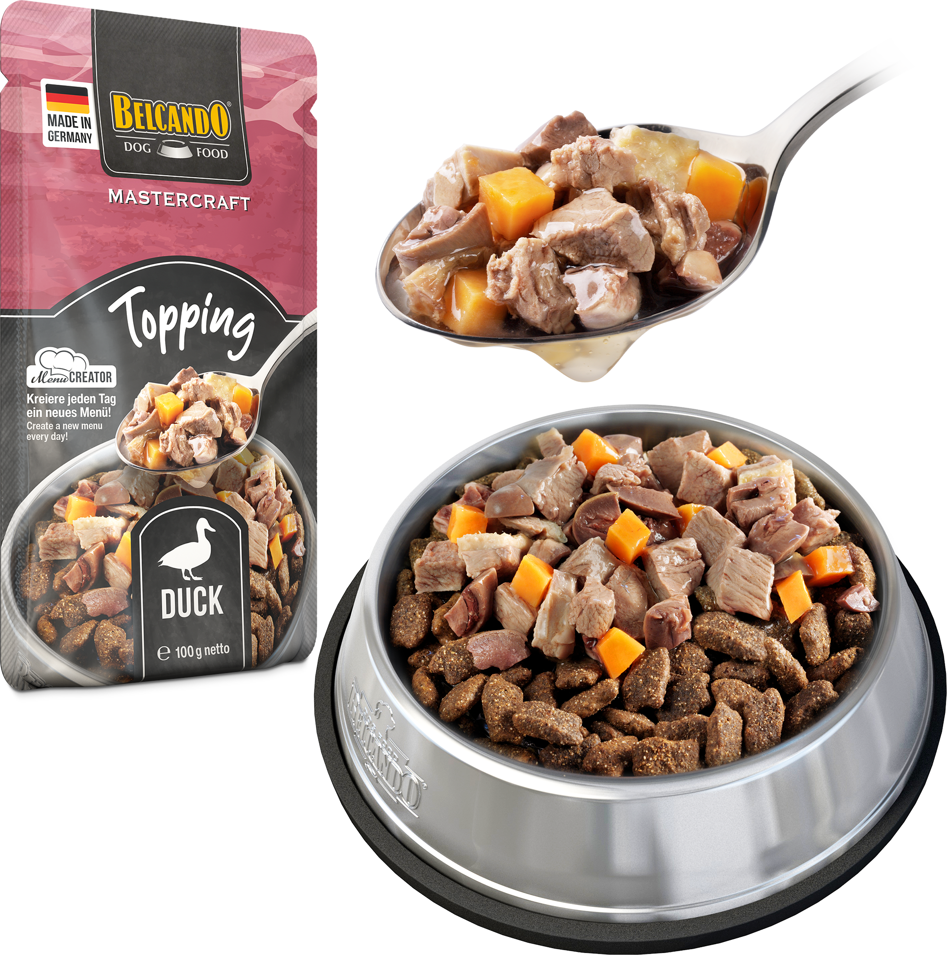 Ihr Hund ist ein echter Feinschmecker und liebt den Geschmack von knackigen Kroketten und schonend gegarten, saftigen Fleischwürfeln in leckerer Brühe? Dann sind unsere Toppings genau die richtige Lösung.